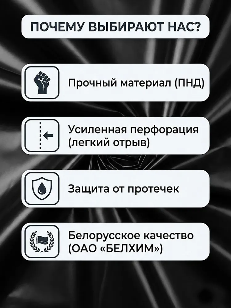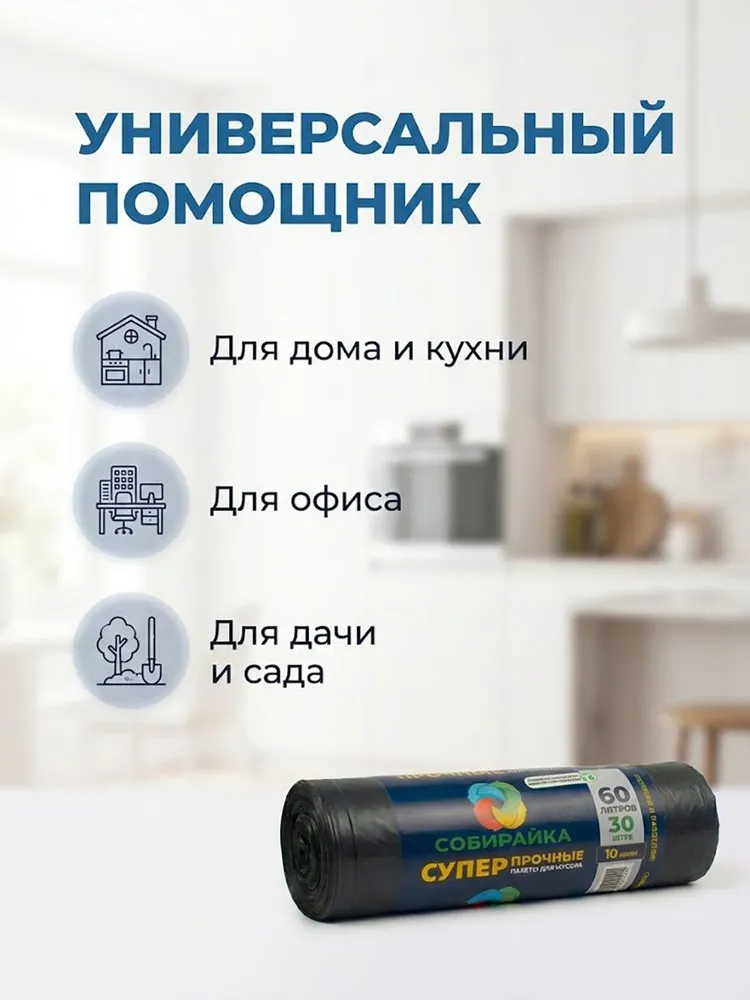 Прочные черные мешки для мусора «Собирайка» объемом 60 литров — универсальное решение для поддержания чистоты дома, в офисе или на даче. В комплект входит 30 пакетов (1компактный рулон ), что обеспечивает выгодный запас на длительное время. Оптимальная толщина 10 мкм и надежная спайка дна гарантируют защиту от разрывов и протеканий при сборе стандартного бытового мусора. Благодаря качественной перфорации пакеты легко отделяются от рулона. Идеально подходят для большинства стандартных высоких мусорных ведер. Произведено в Беларуси (ОАО «БЕЛХИМ»).