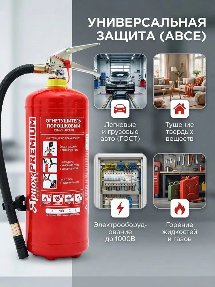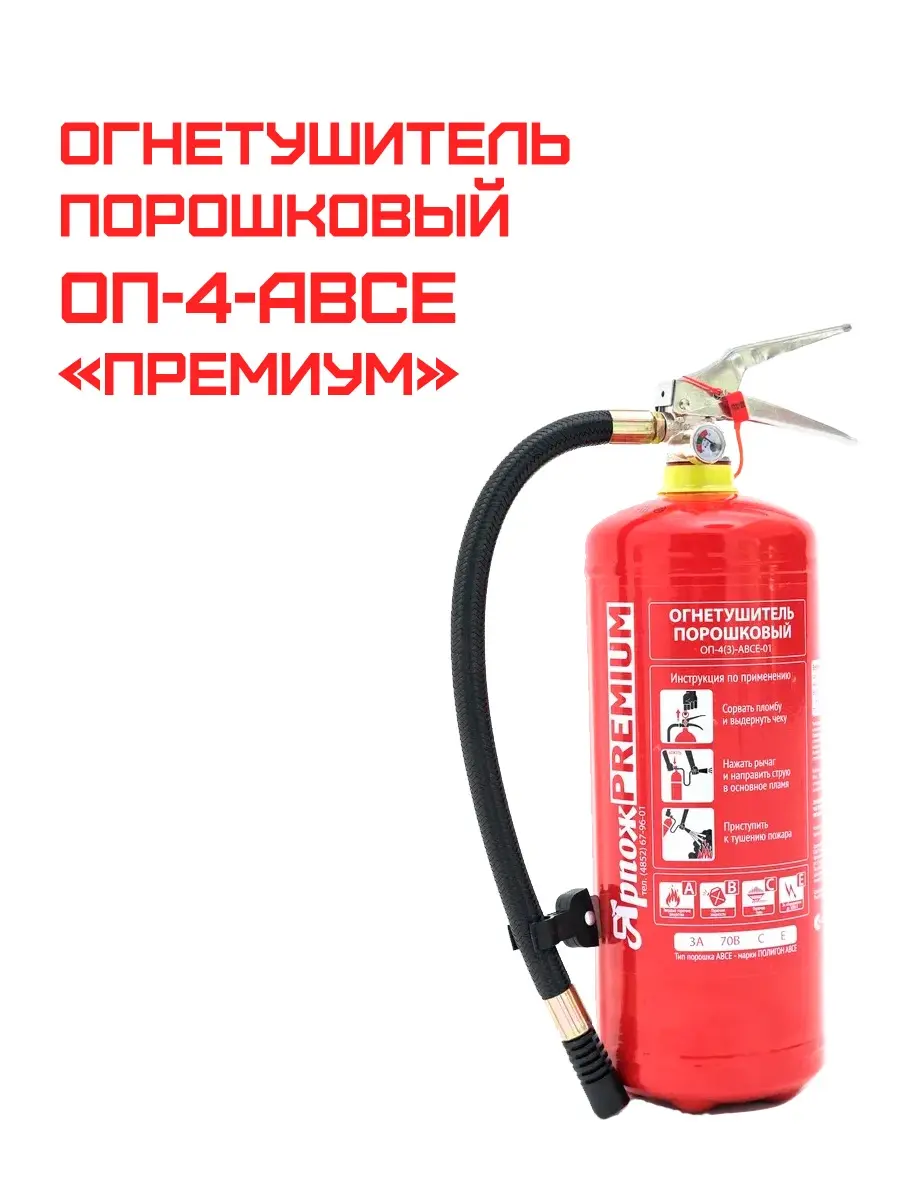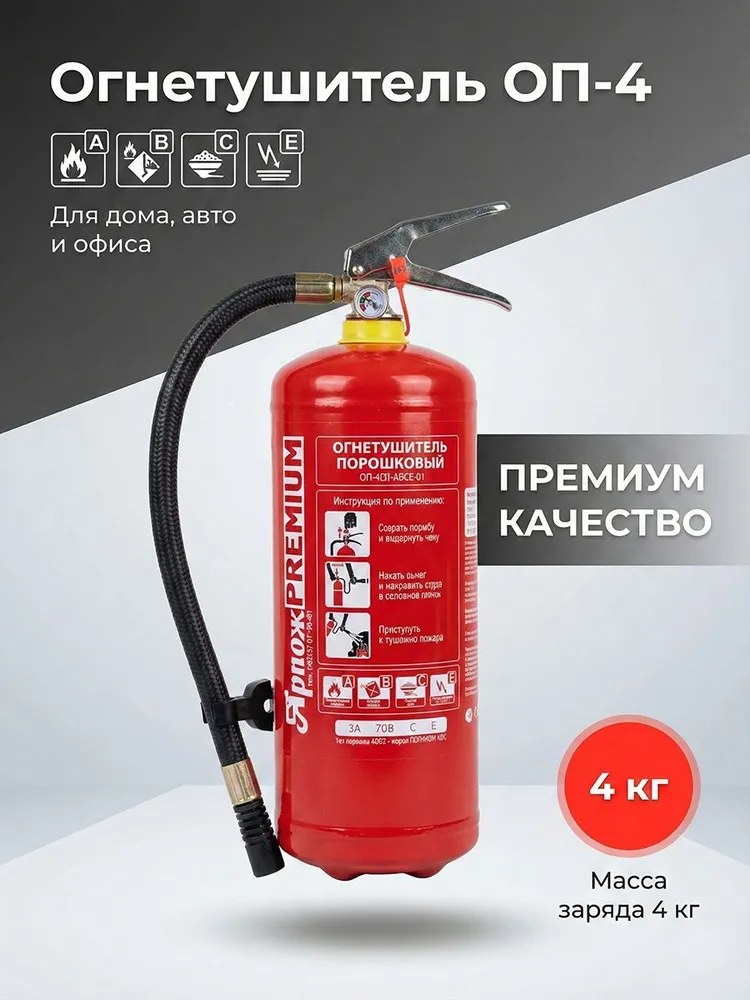 Огнетушитель порошковый ОП-4(з) АВСЕ «Премиум» — «золотой стандарт» пожарной безопасности. Наиболее востребованная модель для оснащения грузового транспорта, офисов, магазинов и гостиниц. Отличается повышенной огнетушащей способностью и качеством исполнения корпуса.